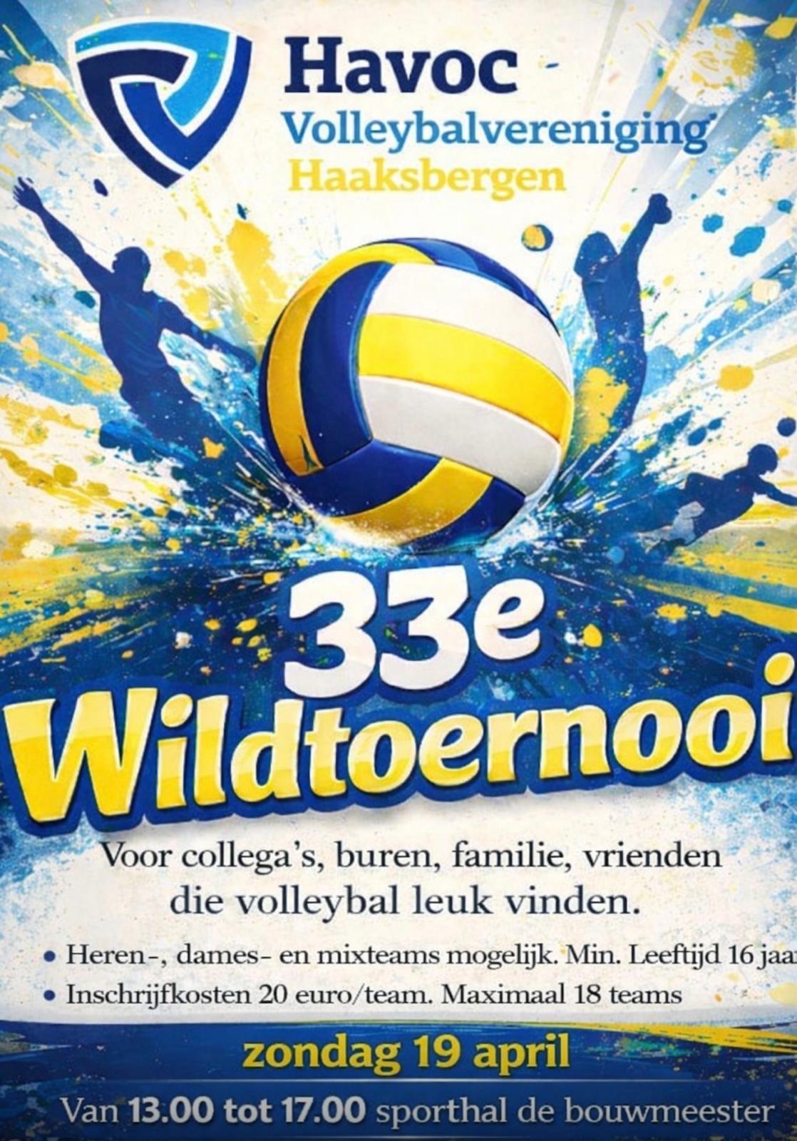 Zondag 19 april 2026 zal weer het jaarlijkse “Wildtoernooi” plaatsvinden. Lekker volleyballen voor iedereen, dit jaar voor de 33e keer!!!